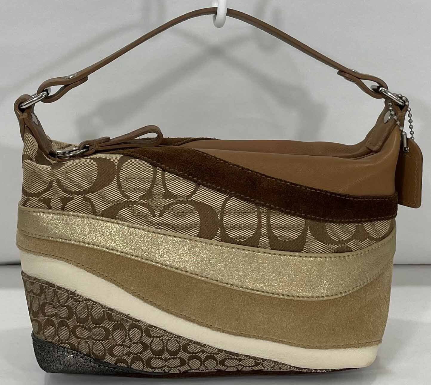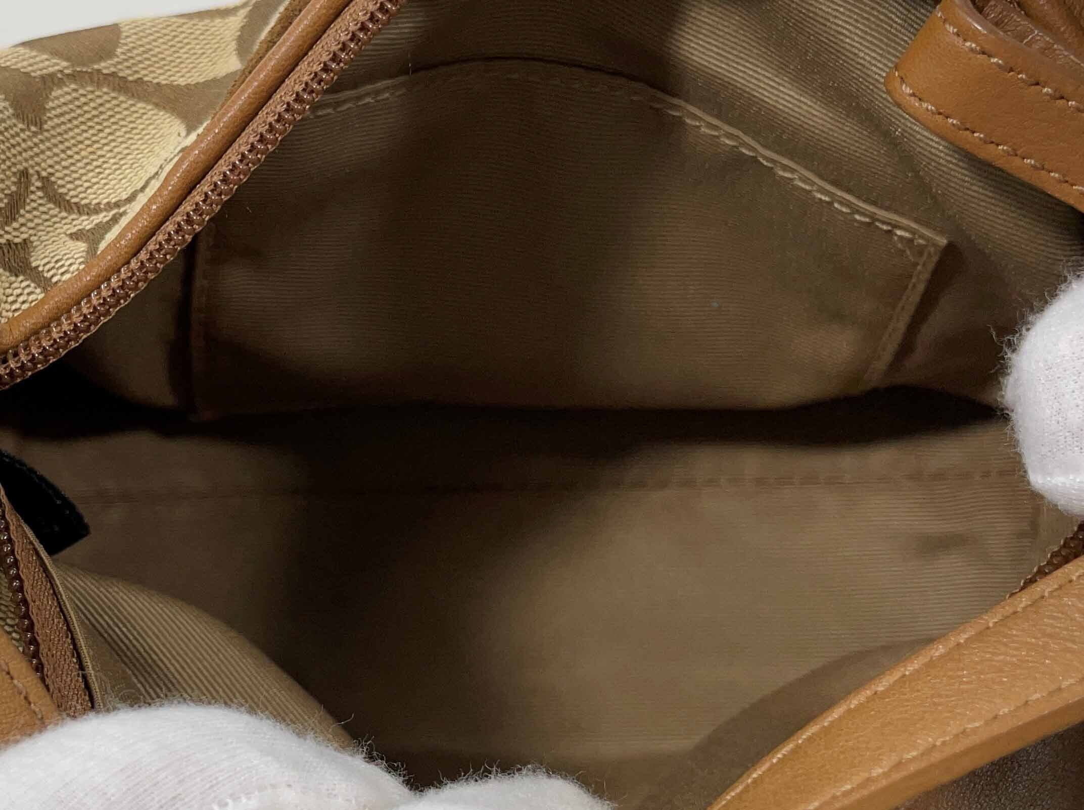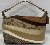 COACH コーチ シグネチャー ハンドバッグ キャンバス スエード レザー ベージュ 茶 ゴールド パッチワーク