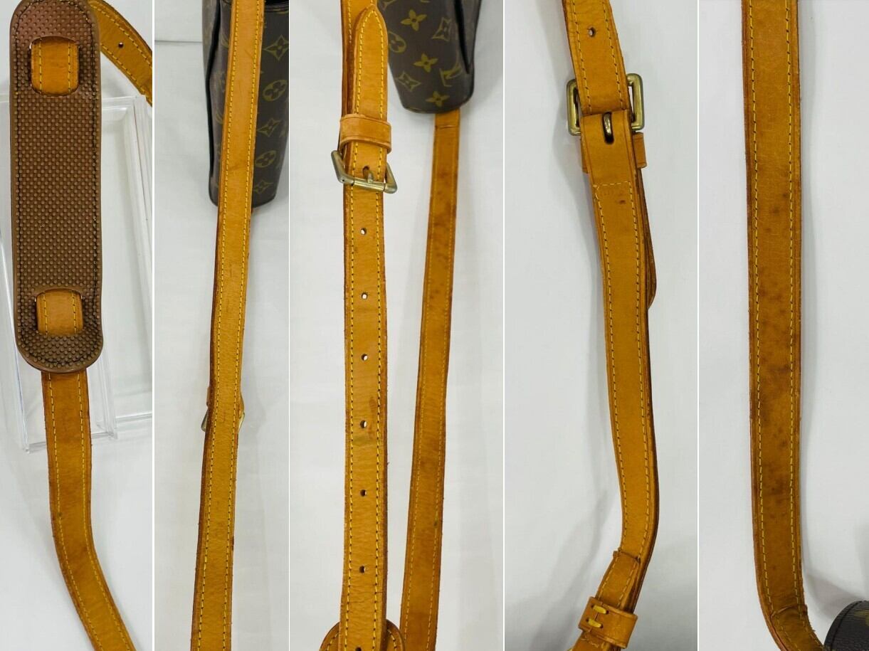 全体的に、使用感あり、皮が固くなっています。ストラップにヒビ、側面に薄い擦れ、裏面右側下部に小さな汚れがありますが状態は非常に綺麗です。